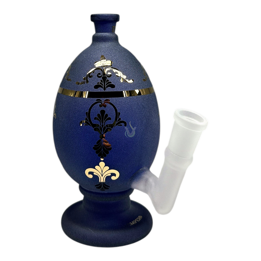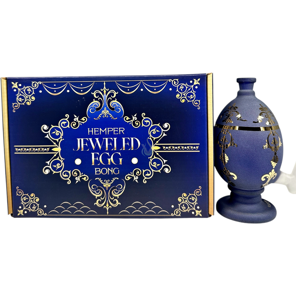 The Hemper 5.5 Inch Jeweled Egg Bong is a compact, glass mini water pipe engineered for approachable, everyday use with dry herb. It combines an egg-shaped chamber and a stable pedestal base with jeweled, Fabergé-inspired detailing in metallic gold over a deep matte sapphire finish. A side-mounted clear/frosted glass joint supports compatible accessories, delivering a refined look and a space-efficient footprint suited to a wide range of customers—from first-time buyers to seasoned collectors.